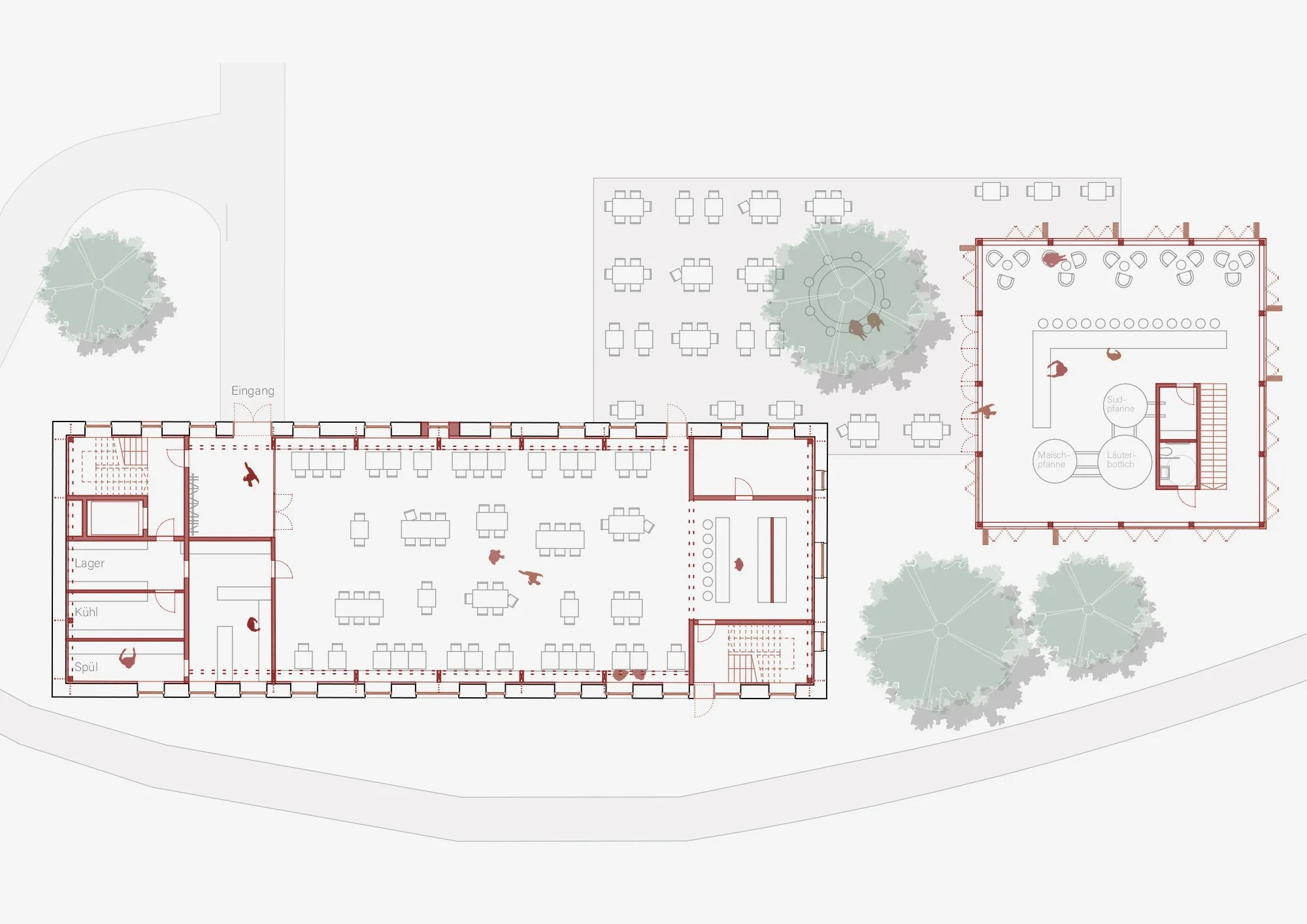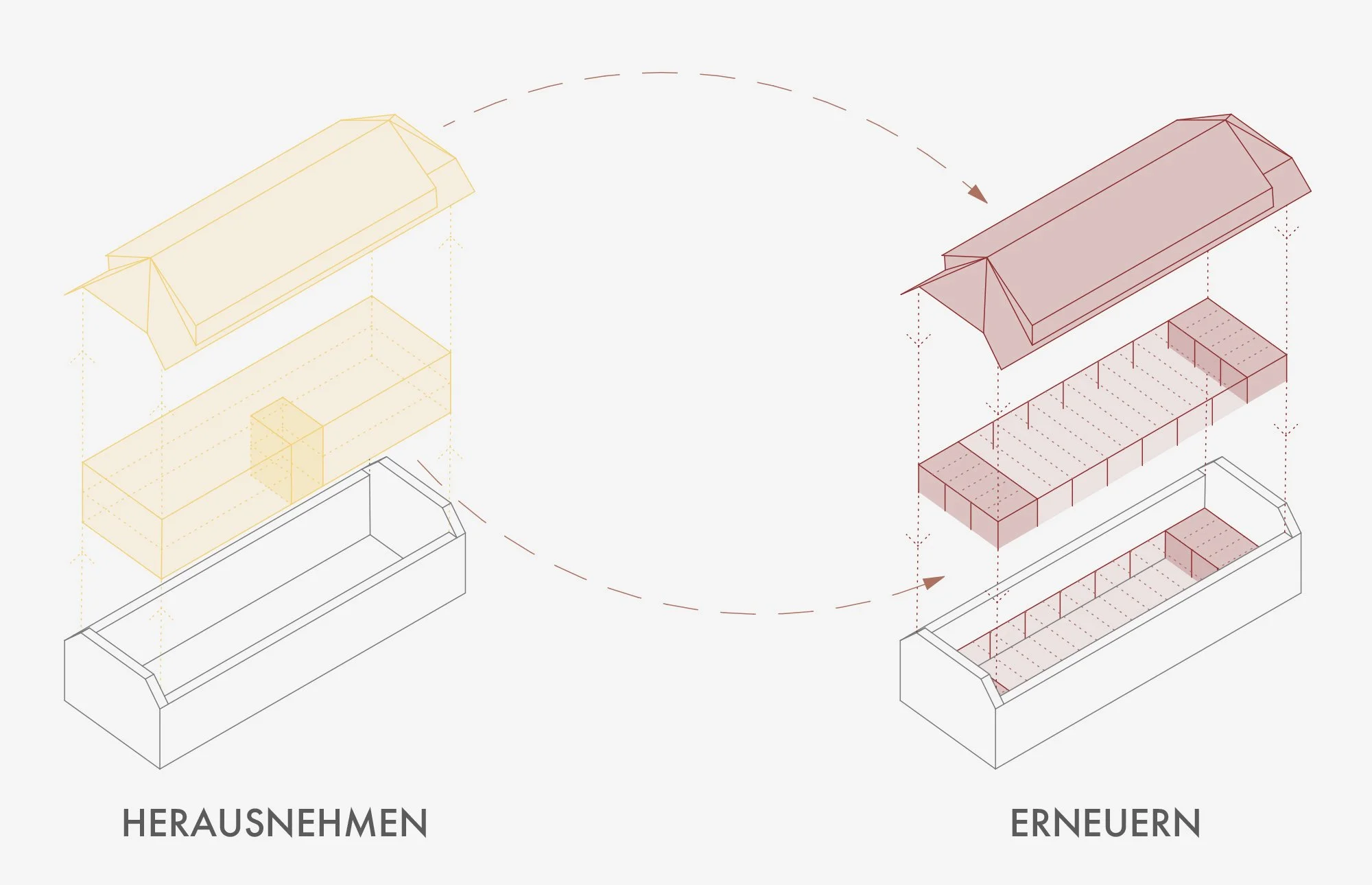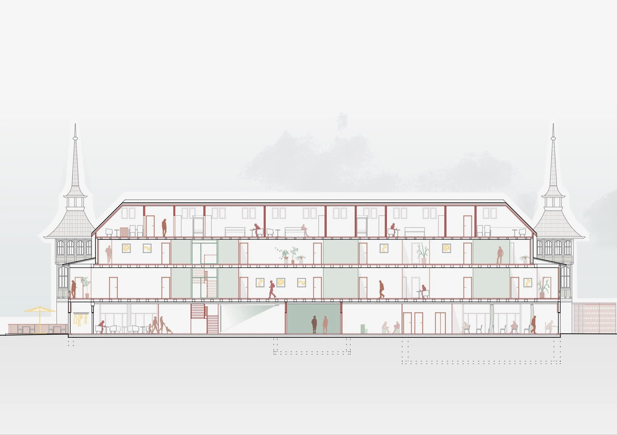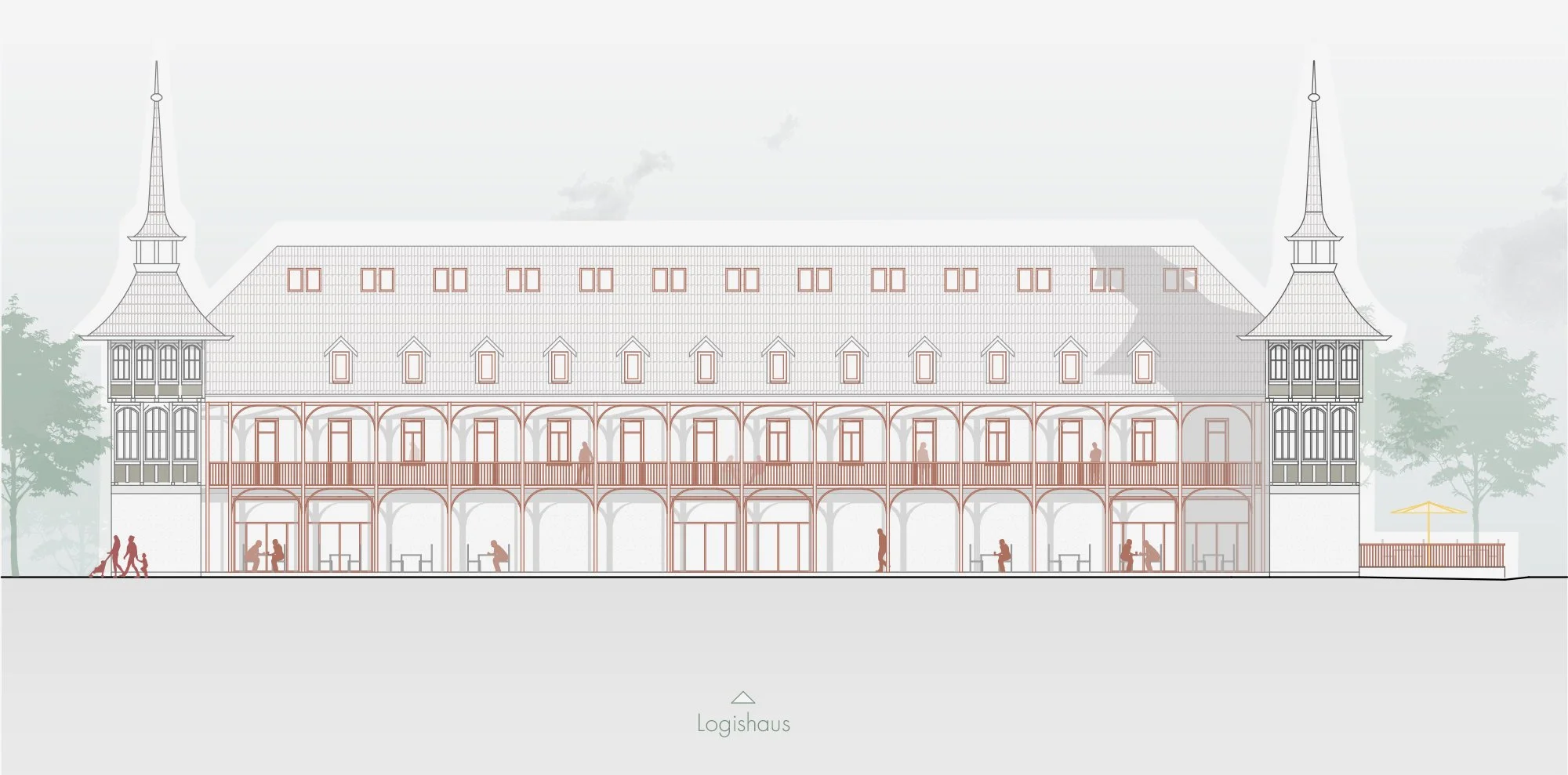 Die Bestandsstruktur des Logishaus wird erhalten, während neue Gemeinschaftsräume im EG und flexibel nutzbare Zimmer im OG subtil integriert werden.