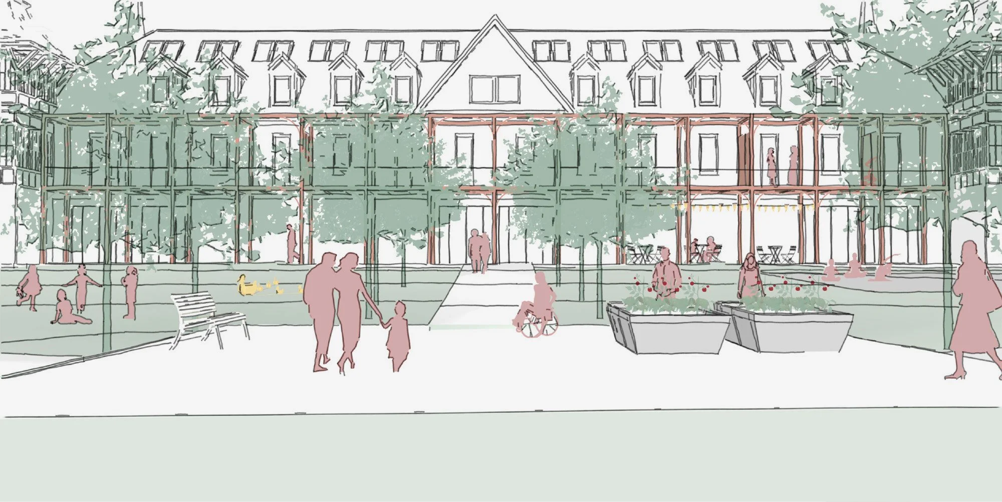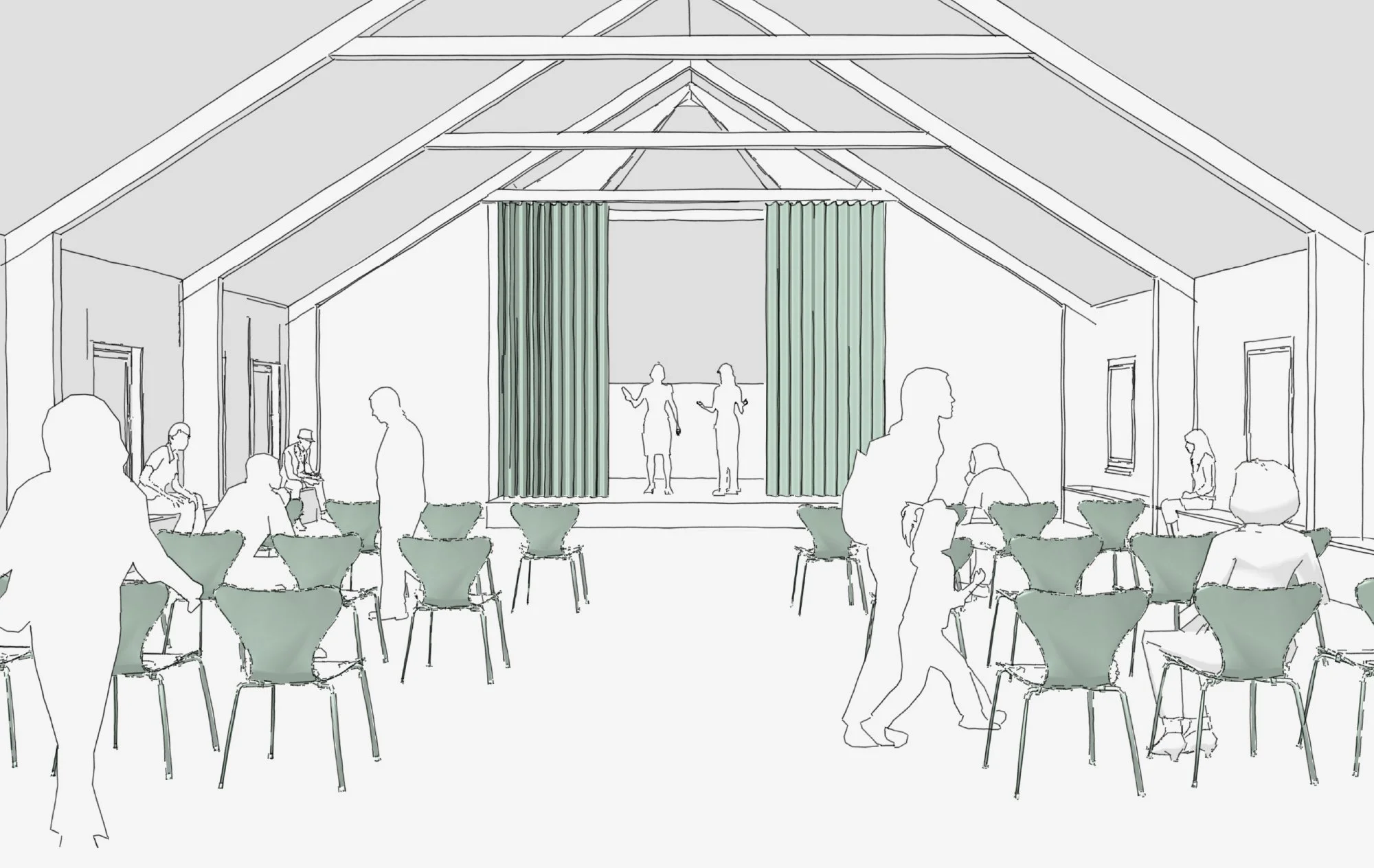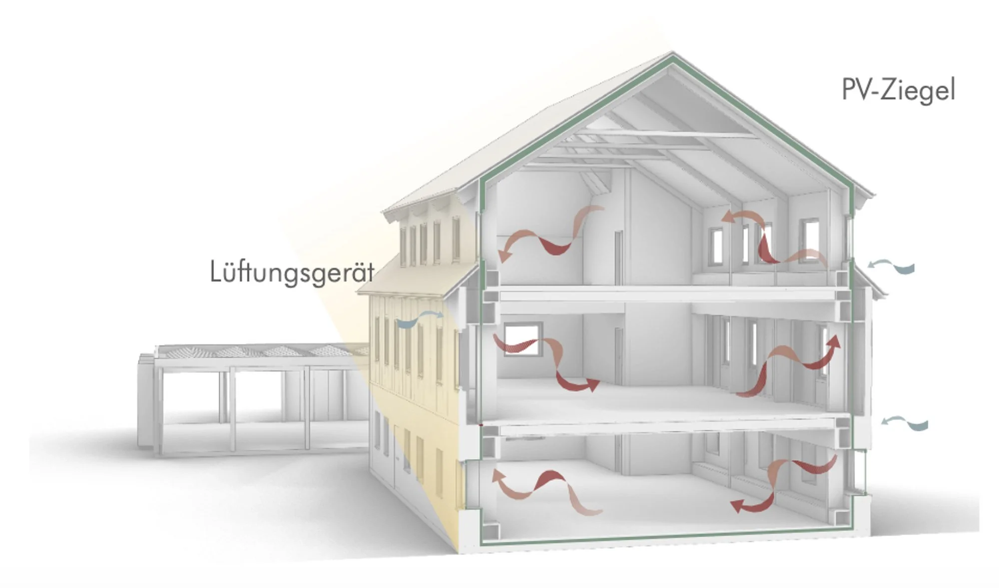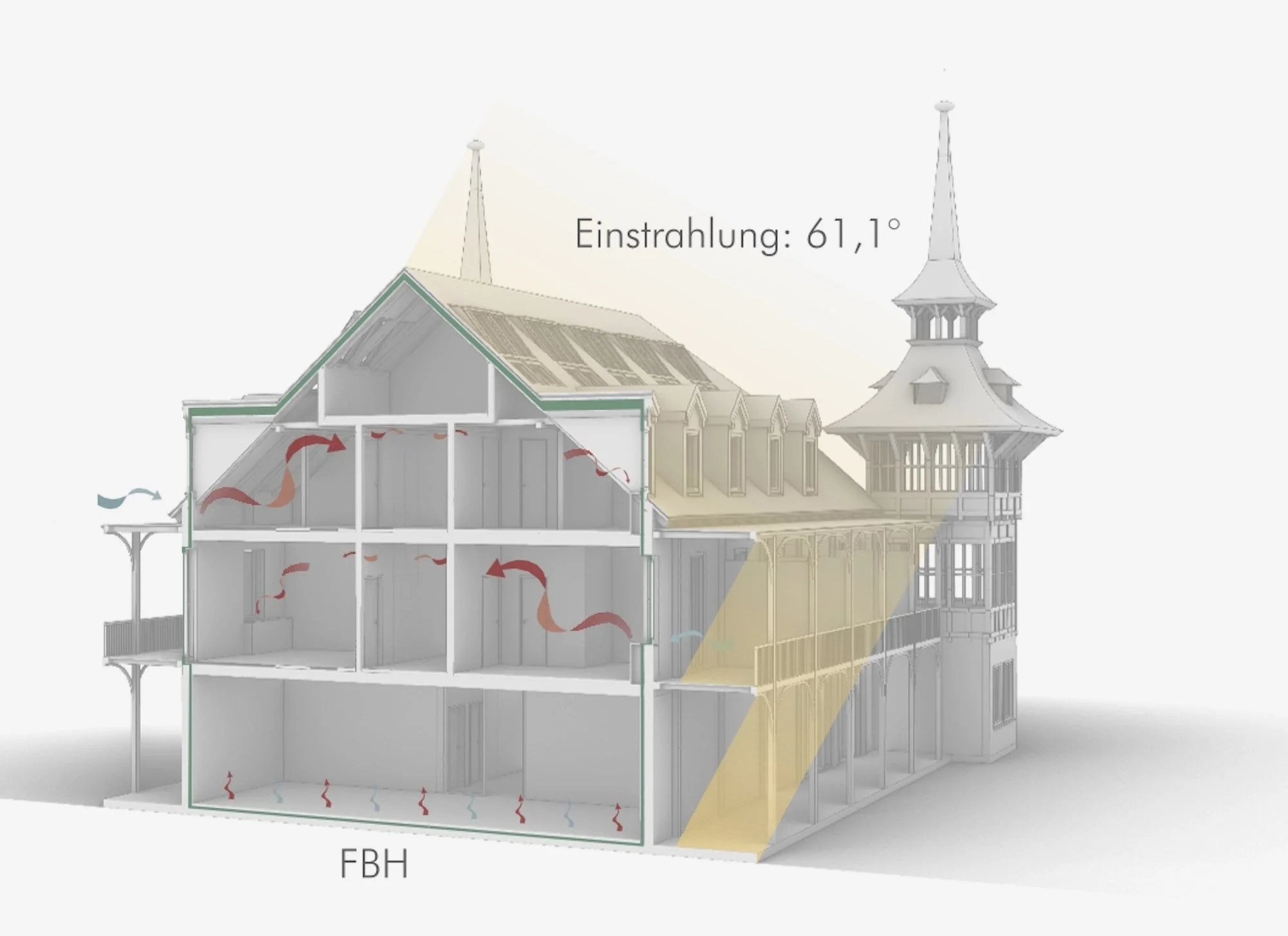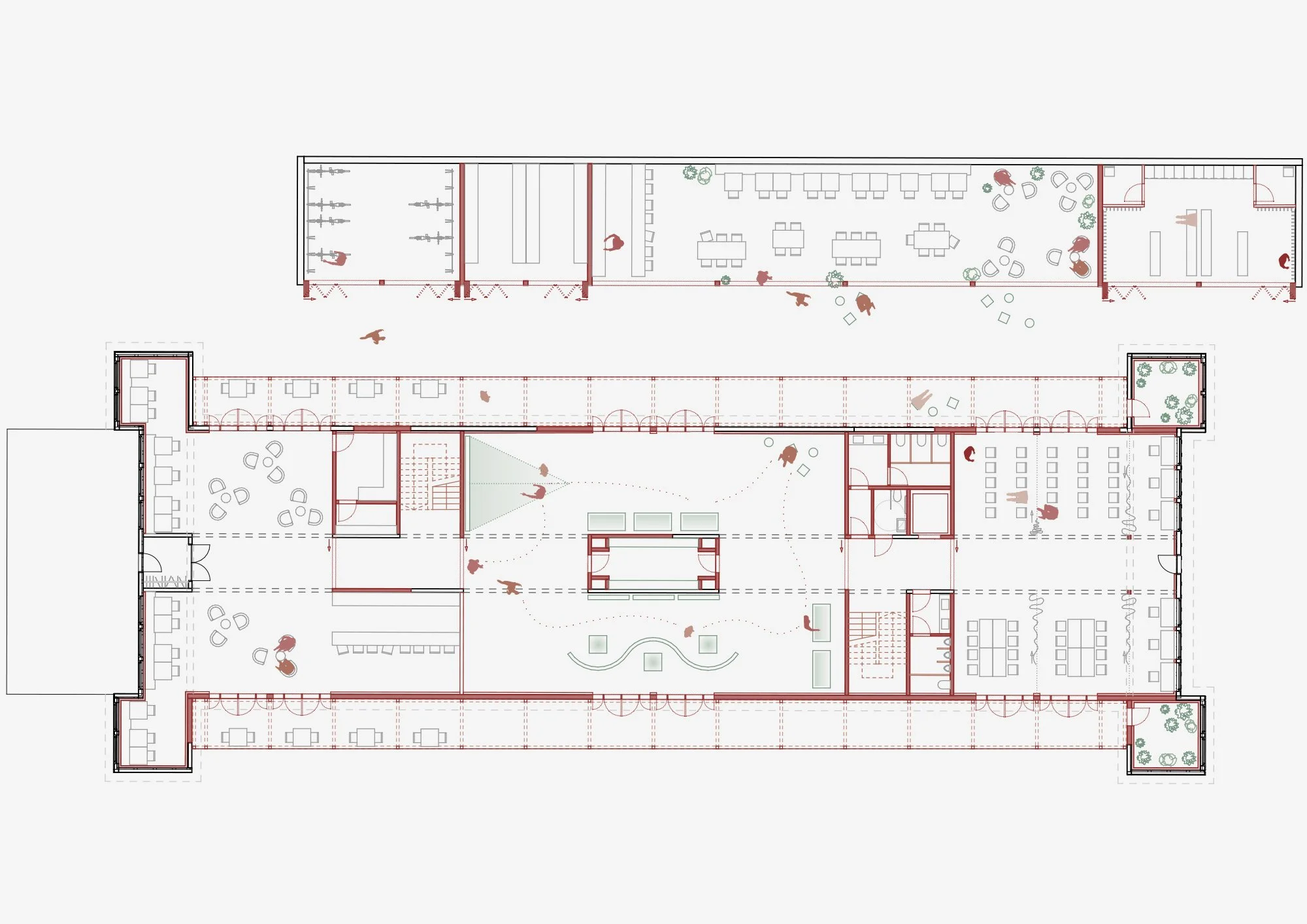 Die Bestandsstruktur des Logishaus wird erhalten, während neue Gemeinschaftsräume im EG und flexibel nutzbare Zimmer im OG subtil integriert werden.