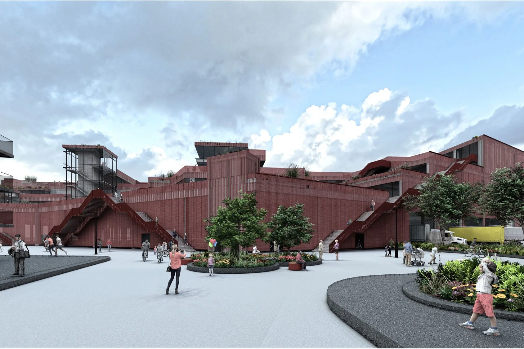 Das Gebäude lädt mit seiner offenen Gestaltung, den außenliegenden Erschließungen und den terrassenförmigen Ebenen dazu ein, entdeckt zu werden. Jede aufsteigende Ebene eröffnet durch ihre Perspektive einen spannenden Ausblick auf die nächste und macht neugierig, weiterzugehen und den CityHub Stück für Stück zu erkunden. Entlang der Aufstiege sind öffentliche Nutzungsbereiche geschickt als adaptive, hervorgehobene Volumina angeordnet und setzen interessante Akzente.