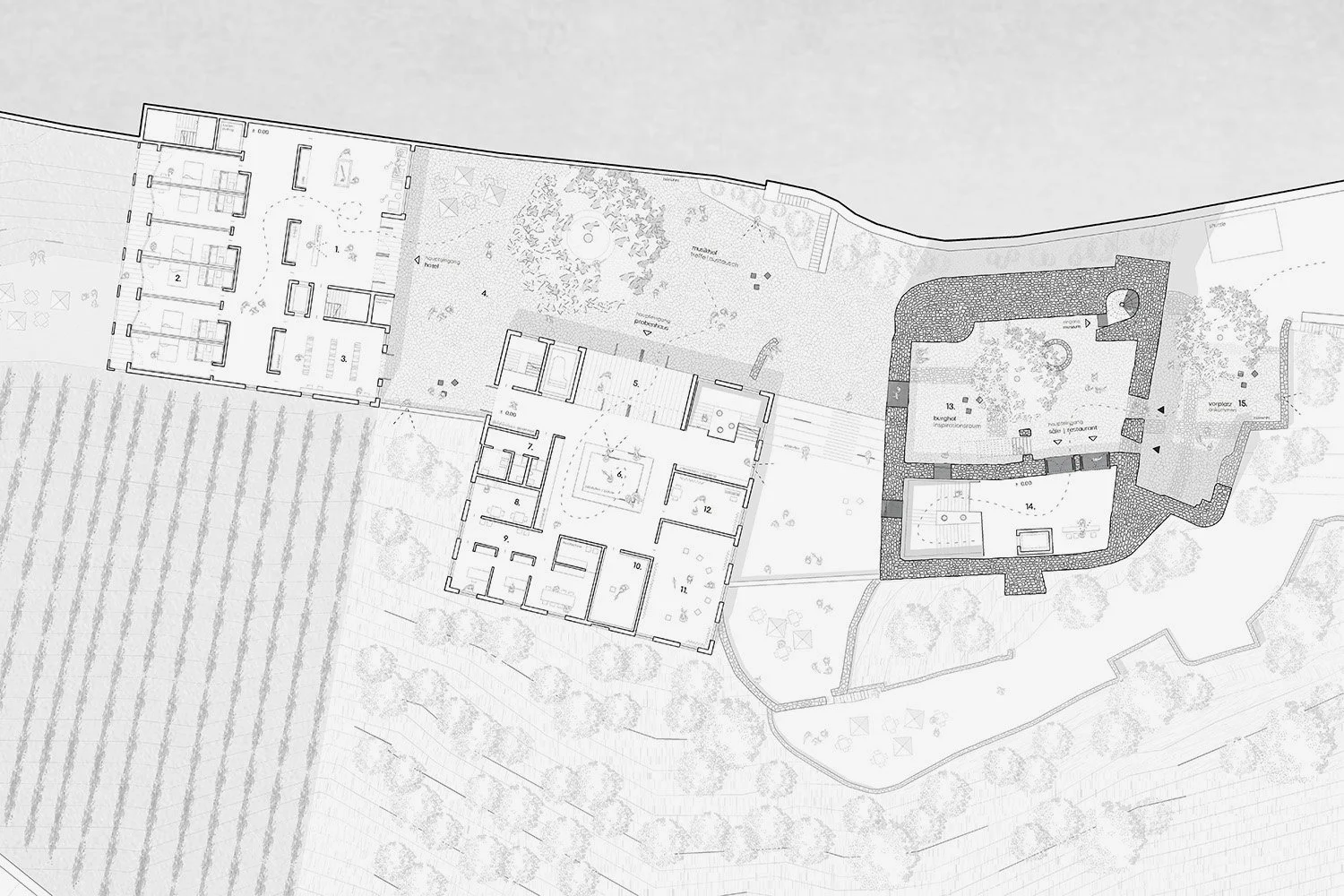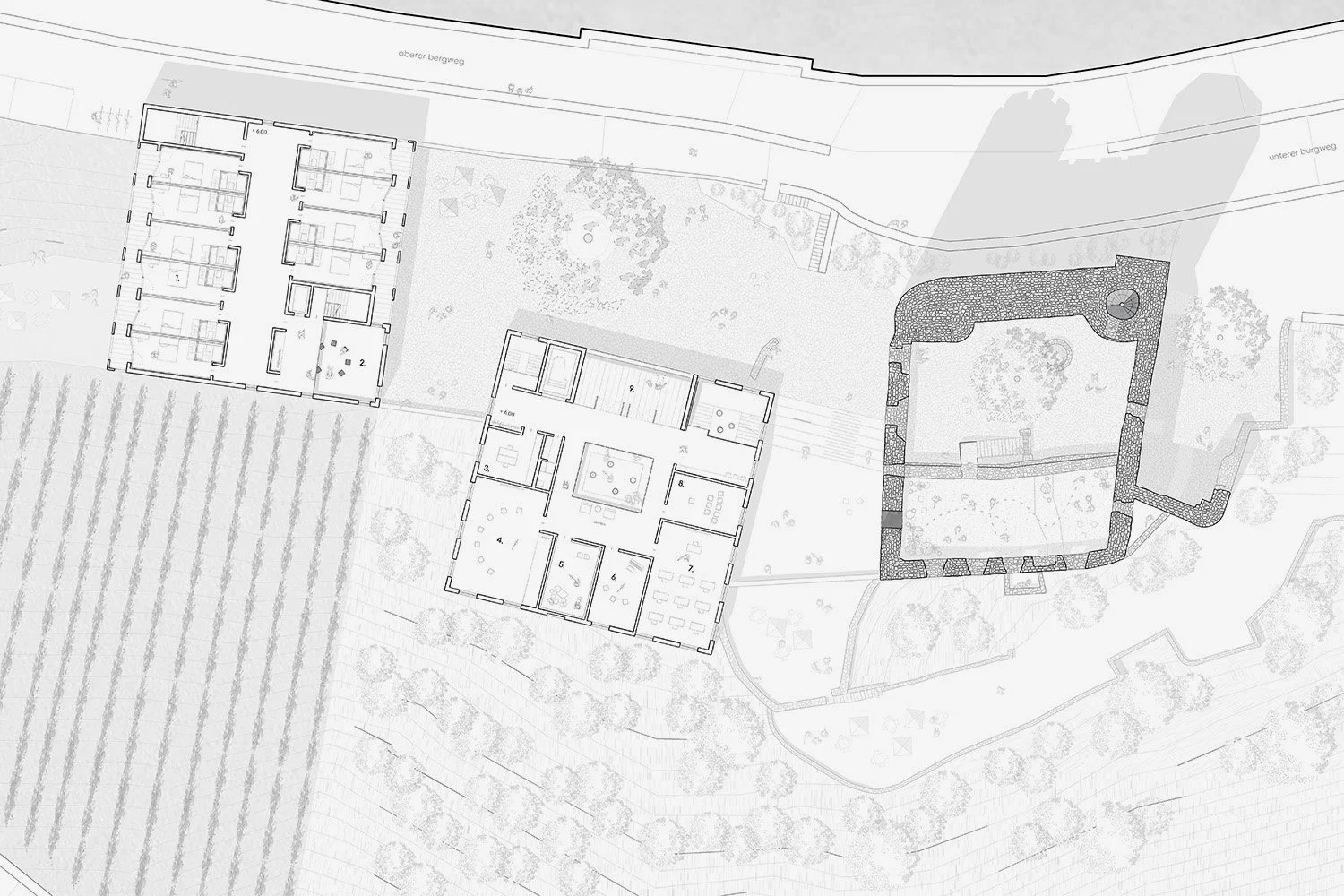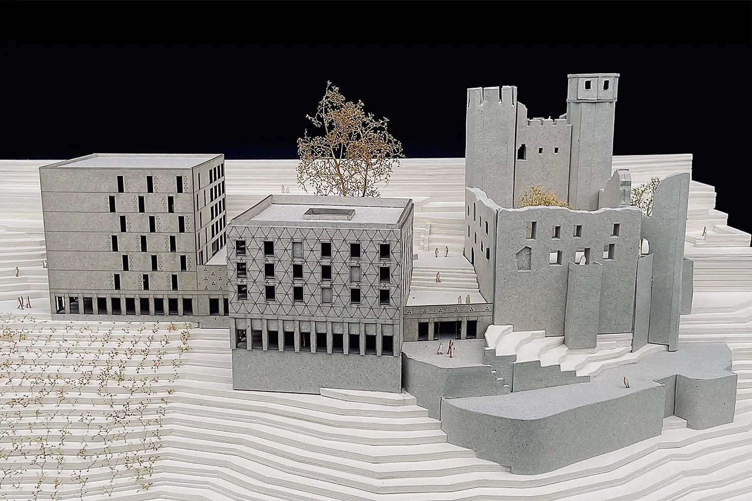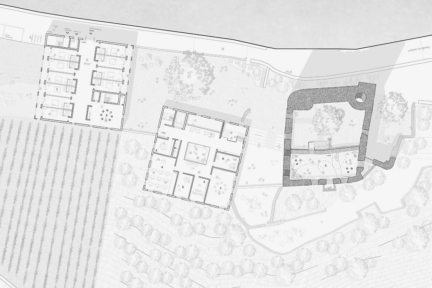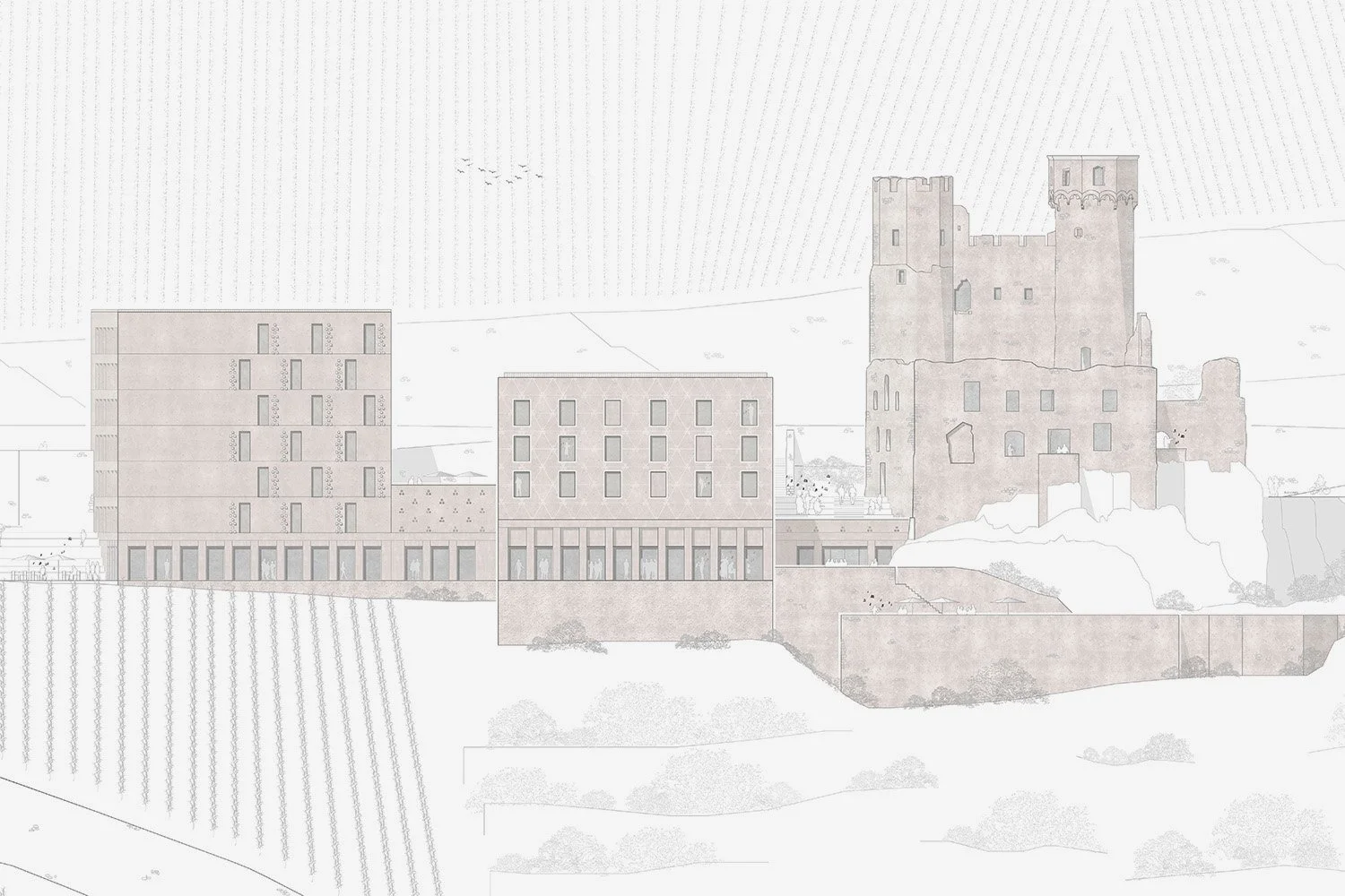 Ein Ort, geprägt von Einklang, Geschichte und schlummerndem Potenzial. Im Zusammenspiel von Alt und Neu verbindet der Entwurf Vergangenheit und Gegenwart. Das Erscheinungsbild der Burgruine bleibt erhalten und wird durch die Ergänzung gleichwertiger Baukörper in ihrer Silhouette weitergeführt. In seinem Erscheinungsbild fügt sich das neu gestaltete Ensemble harmonisch in die bestehende Landschaft ein und zeigt sich respektvoll im Umgang mit dem Bestand.